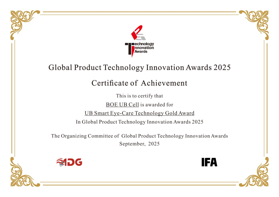 基于京东方行业领先的ADS Pro技术,京东方自主研发全新一代高端液晶显示技术解决方案UB Cell 4.0,凭借在画质表现、健康护眼及技术整合上的革命性突破,一举斩获“IFA2025全球产品技术创新大奖- UB智能护眼技术金奖(UB Smart Eye-Care Technology Gold Award,Global Product Technology Innovation Awards 2025)”,以优于VA LCD和OLED的优异性能被誉为“性能平衡的最佳LCD解决方案”。